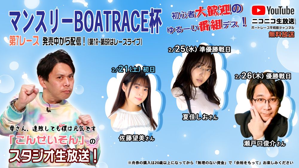 - 【時間】スタジオ生放送は、初日・準優勝戦・優勝戦日の第7レース発売中から配信